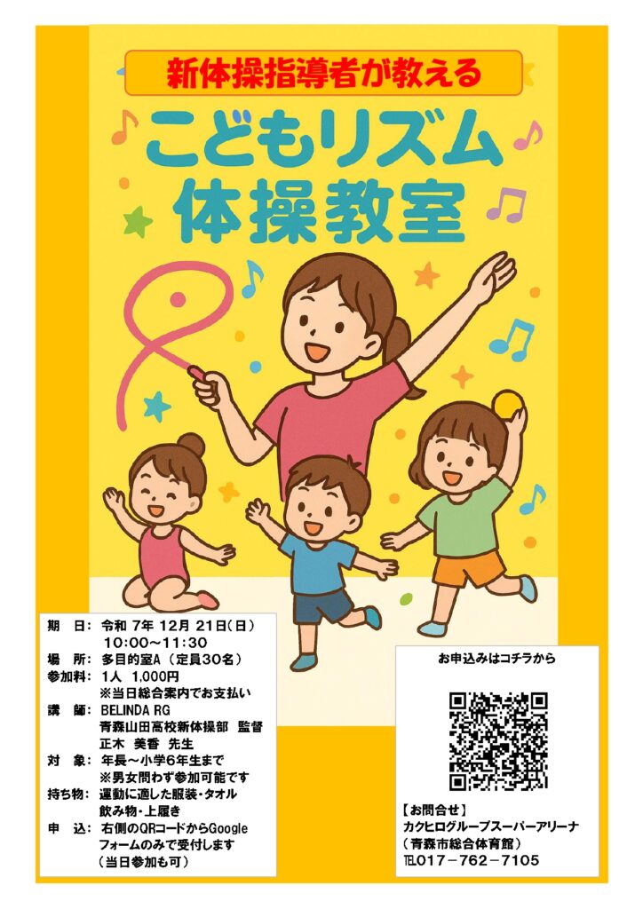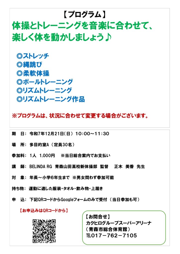 新体操指導者が教える「こどもリズム体操教室」のご案内 2025 11/26 イベント お知らせ 2025年11月26日 イベント お知らせ キッズルームに関するお知らせ 親子で楽しむハッピービクス12月
