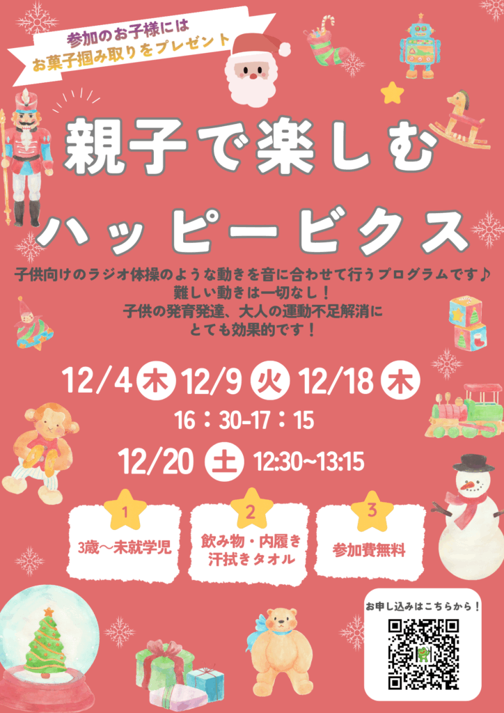 親子で楽しむハッピービクス12月 2025 11/28 お知らせ 2025年11月28日 簡単なダンスをしたり、親子レクをしたり等、親子で楽しめる45分間プログラムです♩ お気軽にご参加ください! お知らせ 新体操指導者が教える「こどもリズム体操教室」のご案内 令和7年12月の利用予定表(11月27日更新)
