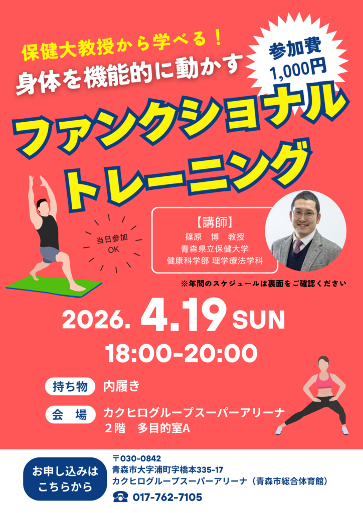保健大コラボ「ファンクショナルトレーニング」 2026 4/03 イベント お知らせ 2026年4月9日 大好評!保健大教授から学べる講演会! 令和8年度の予定が決定いたしました。 各日程で内容が変わりますので、5月以降の内容は追って配信いたします! お気軽にご参加ください🌸 イベント お知らせ キッズルームに新しい遊具を導入しました‼ 「AKスポーツフェス2026」開催のご案内